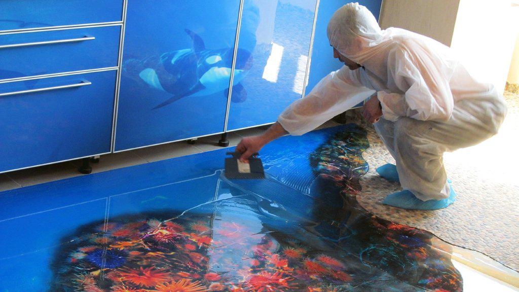 Au stade initial, la poussière est enlevée de la base en béton, la surface est nivelée, les nids-de-poule et les fissures sont réparés.De plus, à l'aide d'une perceuse électrique avec une buse de meulage ou d'un outil spécial, un meulage sec et humide d'une chape en béton rugueuse est effectué, toutes les irrégularités sont effacées. La base préparée à l'aide d'un aspirateur de construction élimine la poussière et l'amorçage est effectué. Habituellement, 2 couches d'apprêt à pénétration profonde sont appliquées, la première couche est appliquée au pinceau. Après le séchage final de la première couche, la seconde peut être appliquée au rouleau. Avant de réaliser correctement une chape pour un sol en polyuréthane avec un motif décoratif, une couche de base est appliquée, il s'agit d'un mastic autonivelant prêt à l'emploi qui s'étale sur la surface et forme un revêtement de 3 à 4 mm d'épaisseur. Étant donné que ce matériau a une grande fluidité, la base sous-jacente doit être préparée très soigneusement. La condition principale pour l'utilisation d'un tel matériau est une surface de base lisse et préparée. Directement, le mastic polymère lui-même est appliqué à la spatule et roulé plusieurs fois avec un rouleau à pointes. Cette exigence est due au fait que le sol autonivelant en polyuréthane au stade final, qui forme une image tridimensionnelle, nécessite une surface plane avant de poser la toile imprimée sur l'imprimante.