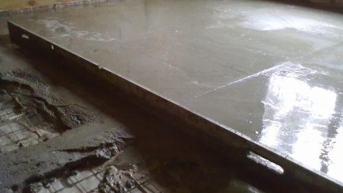 Après avoir installé les balises, ils passent à l'étape principale du dispositif de chape - son coulage. La solution est préparée dans un malaxeur à mortier, si la zone à remplir est grande, ou avec un malaxeur dans un récipient de 30 litres, si la chape est coulée dans l'appartement. Considérez comment remplir correctement la chape. Le mélange fini est réparti dans des seaux entre les profils de balises installés, nivelé et finalement nivelé à l'aide d'une règle qui repose sur les côtés des balises installées. La surface extérieure est amenée à la qualité requise avec une truelle ou une râpe. L'ensemble du processus de remplissage se déroule en poignées en partant du coin le plus éloigné et en se déplaçant vers la porte. C'est la partie la plus critique du travail sur le dispositif de chape et la plus longue. Par conséquent, il est préférable de remplir une chape de ciment ou de béton avec un lien de trois ou quatre personnes.