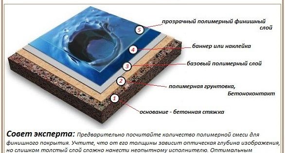 S'il y a un grand désir de décorer la pièce où l'installation est en cours, alors avec plancher époxy c'est très facile à faire. La solution elle-même est claire. Par conséquent, sur la base, sous le futur sol, une image, un arbre, tout autre matériau pouvant ajouter du piquant à la pièce est placé. Après avoir versé tout cela avec un mélange, une véritable œuvre d'art est obtenue.