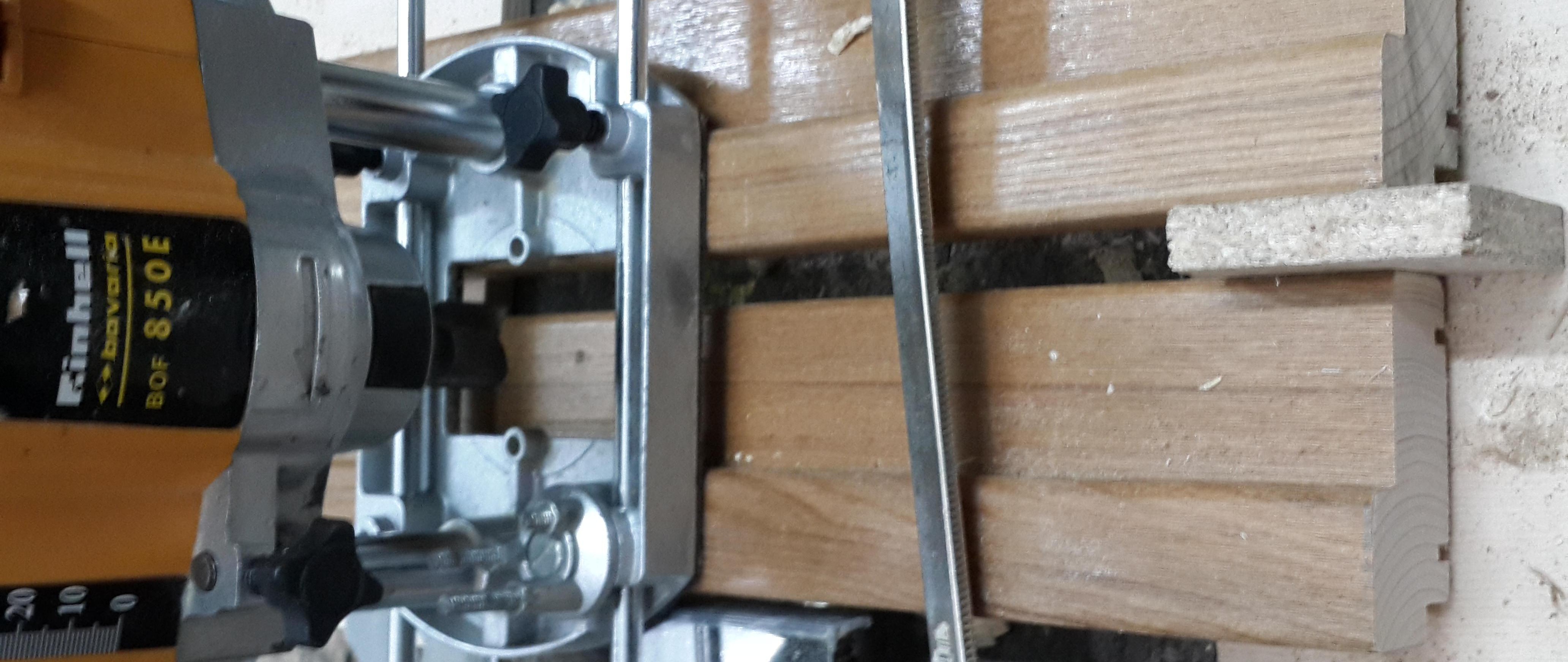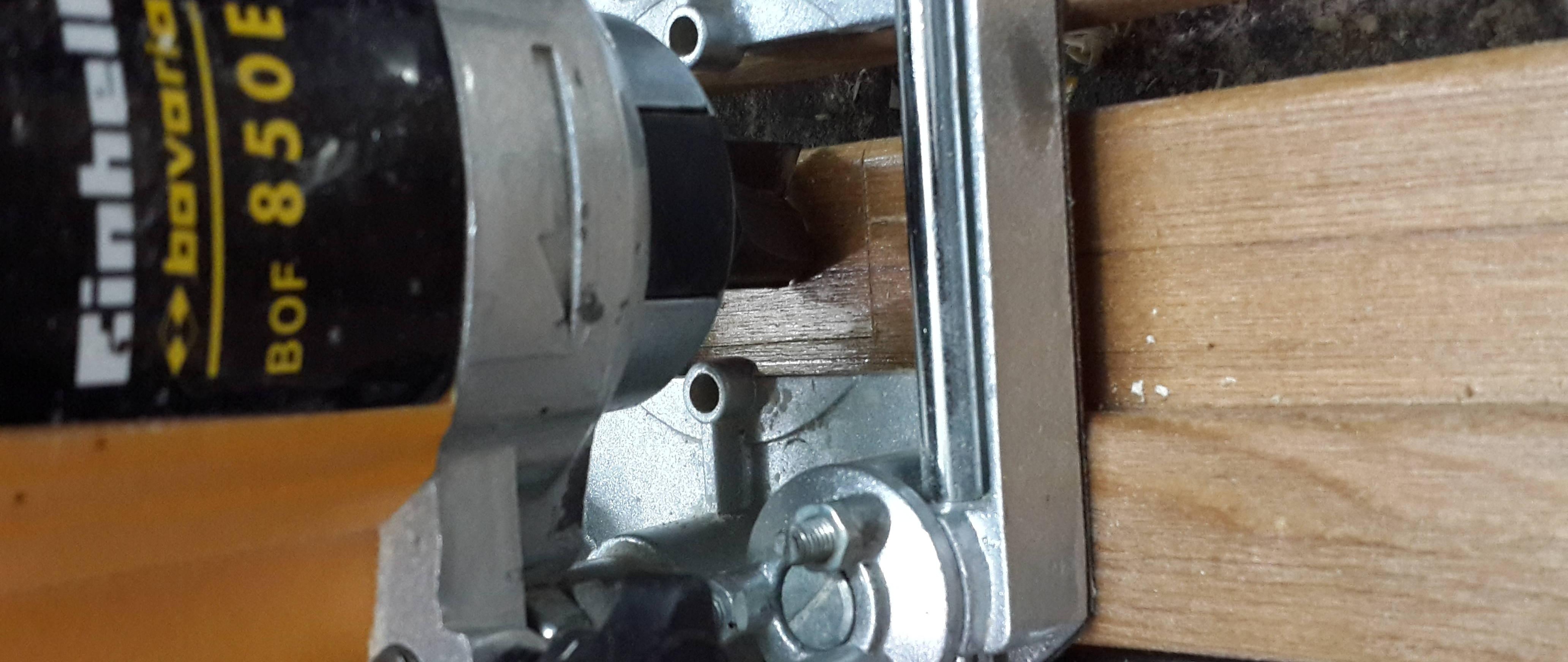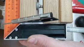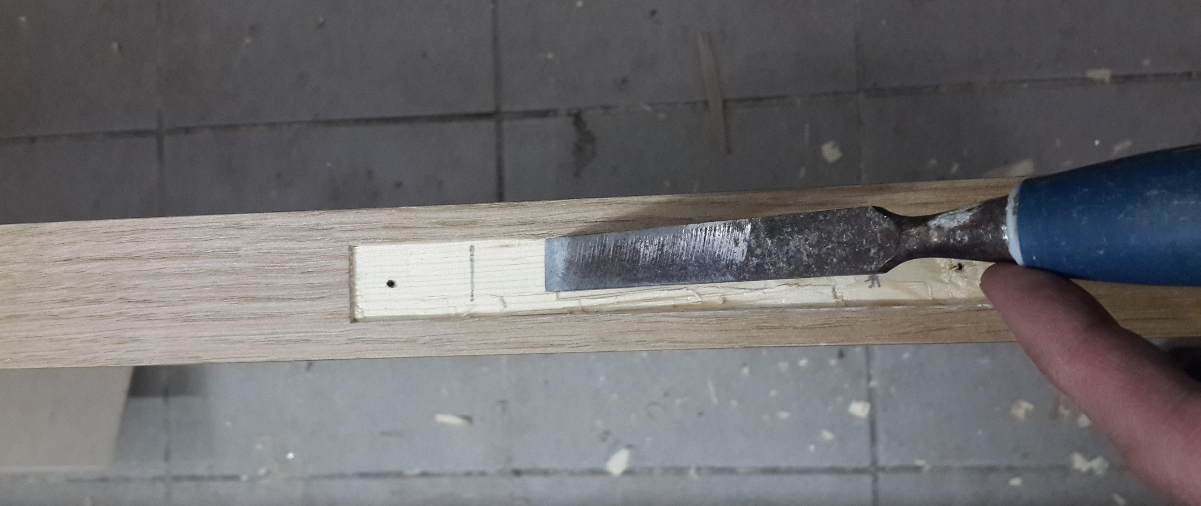 Nous prenons avec l'aide, avec un ciseau nous faisons une sélection. Cela peut être fait avec une fraise, puisque la photo montre la même manipulation, nous définissons la marque zéro plus la profondeur de la boucle. Pour plus de clarté, nous utilisons le deuxième stick de la boîte, il ne vous permettra pas d'approfondir accidentellement l'échantillon. Nous fabriquons un échantillon du cadre de la porte avec une fraise, pour plus de commodité, nous le fixons avec une pince. Après prélèvement, on finalise au ciseau. Ça y est, maintenant nos charnières de porte correspondent clairement.