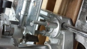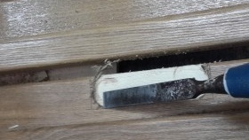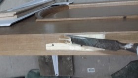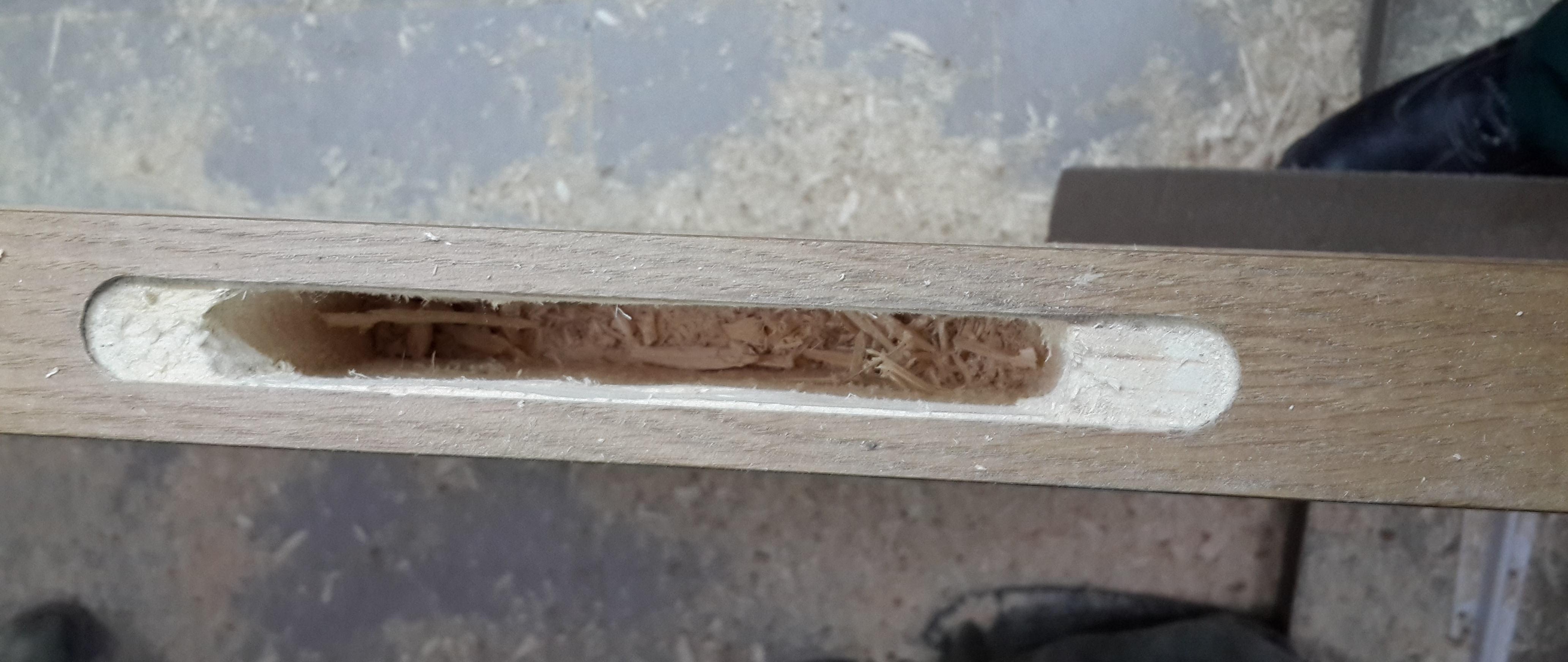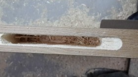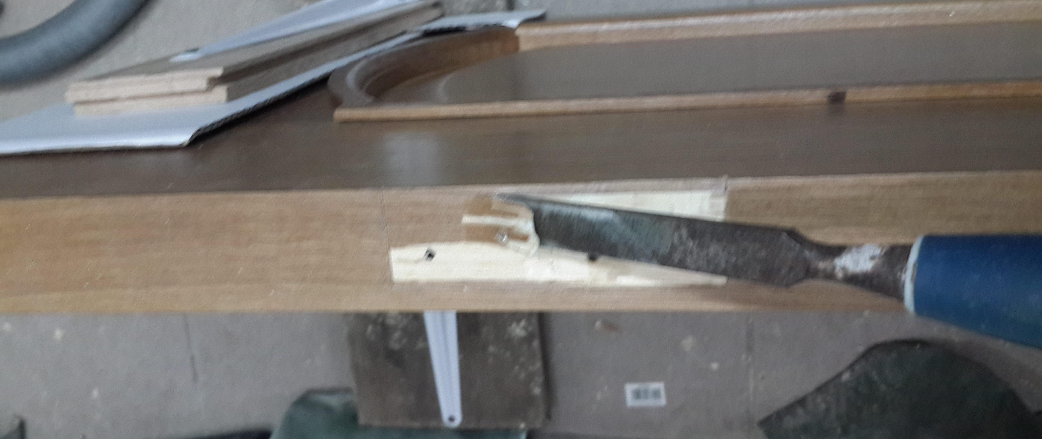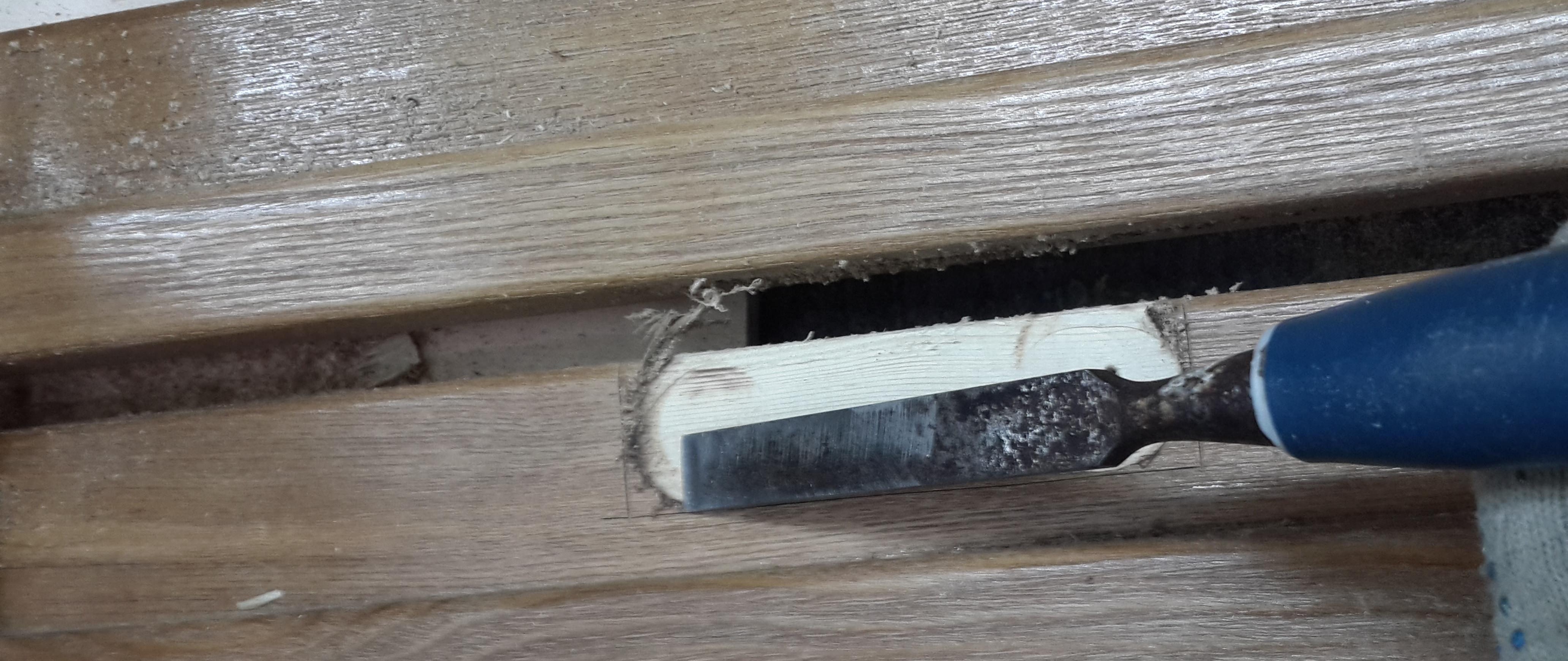 Nous prenons avec l'aide, avec un ciseau nous faisons une sélection. Cela peut être fait avec une fraise, puisque la photo montre la même manipulation, nous définissons la marque zéro plus la profondeur de la boucle. Pour plus de clarté, nous utilisons le deuxième stick de la boîte, il ne vous permettra pas d'approfondir accidentellement l'échantillon. Nous fabriquons un échantillon du cadre de la porte avec une fraise, pour plus de commodité, nous le fixons avec une pince. Après prélèvement, on finalise au ciseau. Ça y est, maintenant nos charnières de porte correspondent clairement.