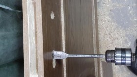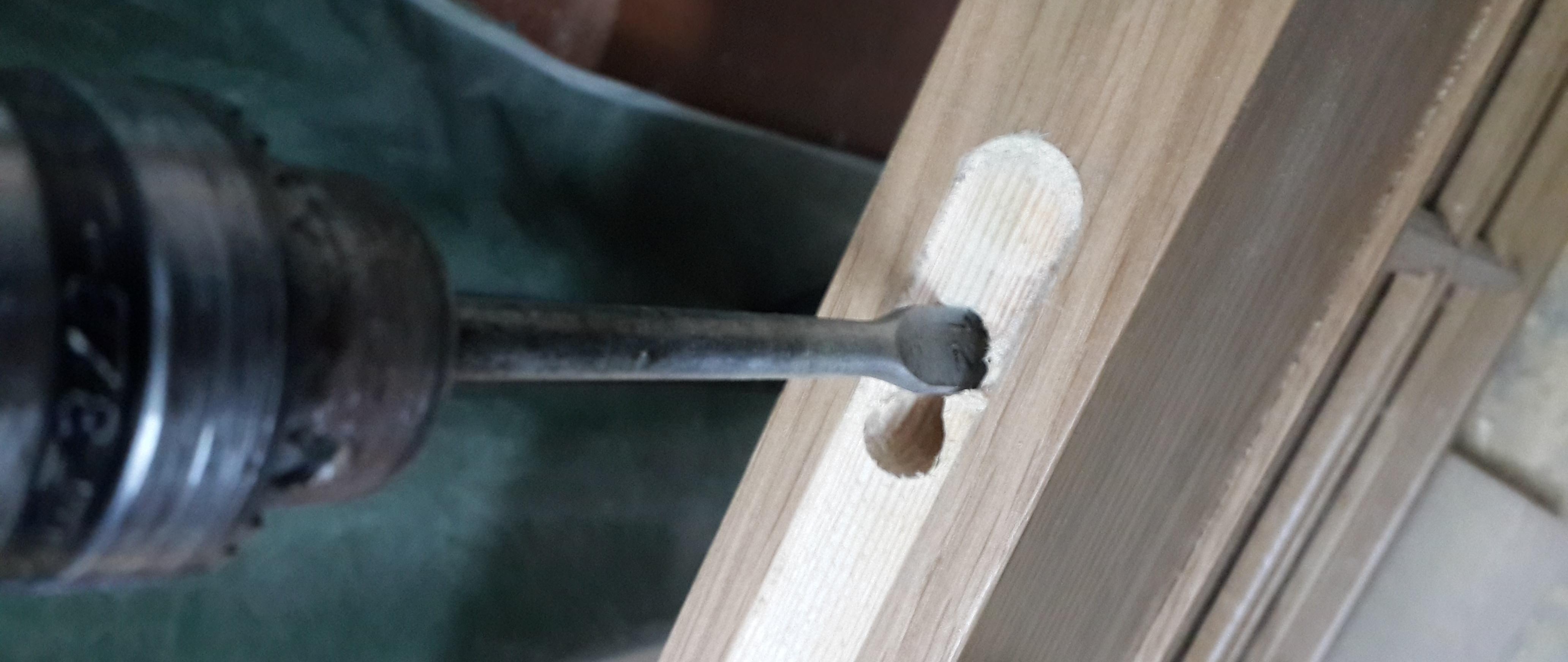 Nous procédons à l'installation de la poignée, marquons les centres de la poignée avec un crayon et décrivons le contour du cylindre de serrure, pour percer des trous, nous utilisons des plumes sur du bois du diamètre souhaité. Assurez-vous de percer des trous des deux côtés de la porte afin de ne pas arracher un morceau de la toile.