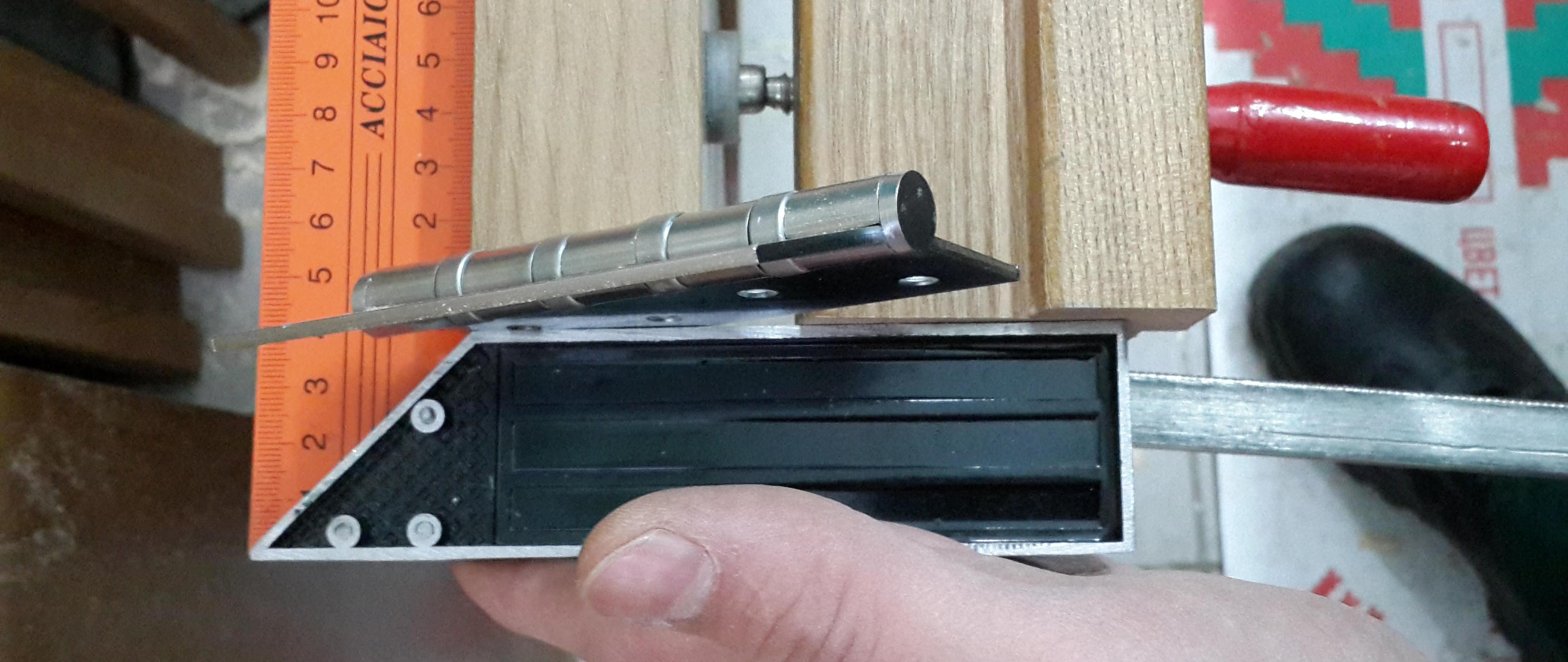 Nous regardons les rails de la boîte pour la courbure. Selon le profil, il existe différents types de délavé, cela peut être à 45 degrés, mais dans notre cas, un profil classique avec un échantillon. Nous coupons même les coins, nous faisons la longueur du rail 2018 mm (cela tient compte de l'écart du sol de 10 mm ou 15 mm et l'écart pour les portes entre le cadre et la porte est d'environ 2 mm). Le moyen le meilleur et le plus rapide pour faciliter l'auto-installation des charnières. Pour ce faire, prenez deux pinces et tournez-les jusqu'à la porte aux extrémités. Nous posons le rail, les boîtes sur la pince par le haut à l'aide d'un carré nous mesurons 3 mm ou utilisons une boucle pour déterminer l'écart.