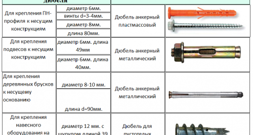bâtiment le plus populaireclou de goujon pour fixer des profilés et des suspentes à un mur en béton se compose de 2 parties. La première partie : la pointe - contient 2 sections, elle est en plastique. La deuxième partie est le clou, qui peut être fileté. Pour monter le cadre sous une cloison sèche, des clous à cheville sont utilisés dans les tailles 6/40, 6/60. Pour fixer le profilé de guidage au mur, ces fixations sont applicables. Cependant, pour la fixation des cintres, il est nécessaire d'utiliser une ancre métallique, car une charge importante tombe sur le cintre, que la cheville en nylon n'est pas en mesure de supporter en raison de ses caractéristiques techniques.