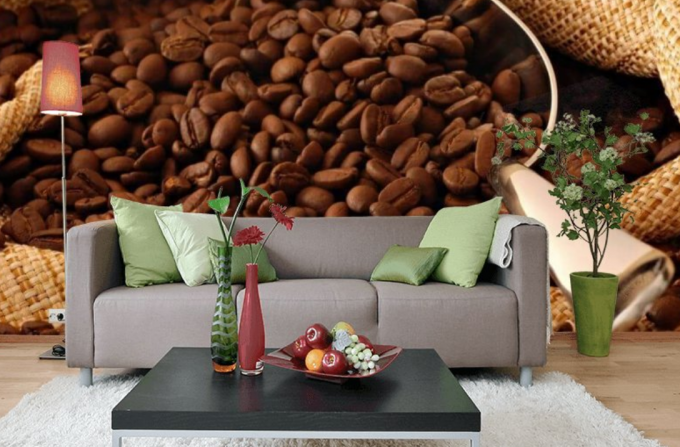 Surtout pour la cuisine, les designers ont imaginé des papiers peints photo avec de délicieuses parcelles - tranches de citron, gros grains de café, natures mortes de fruits et légumes.
