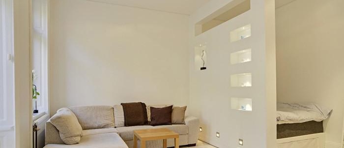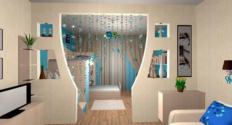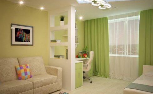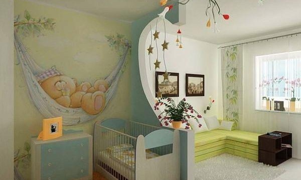 Avec l'avènement d'un enfant, les propriétaires d'un appartement d'une pièce doivent zoner une pièce commune avec l'attribution d'un espace pour une crèche. Il est important que cette mini-pièce soit aussi isolée que possible, aucun bruit étranger n'y pénètre, il y a un éclairage fixe et une sensation de pièce séparée est créée. Pour ce faire, il est proposé de construire des cloisons sourdes en plaques de plâtre pour le zonage de l'espace pour adultes et enfants.
