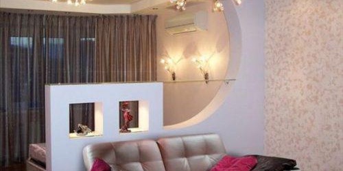 Dans les appartements aux plafonds bas, les concepteurs suggèrent de diviser la pièce en deux zones: une chambre-salon et un bureau - à l'aide de cloisons bouclées. Ils peuvent avoir un relief original le long de la ligne supérieure, différents niveaux de hauteur, des niches, des fentes, des étagères pour de petits objets, des livres, etc.