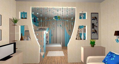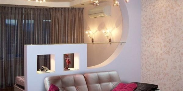 Dans cette option, il n'est pas nécessaire de construire un mur au plafond, de mettre des portes. Il suffit de construire une ouverture voûtée ou de laisser un passage entre le faux et le mur principal. En montant des cloisons en plaques de plâtre pour le zonage des salons, ils créent des éléments intérieurs décoratifs et fonctionnels supplémentaires:
