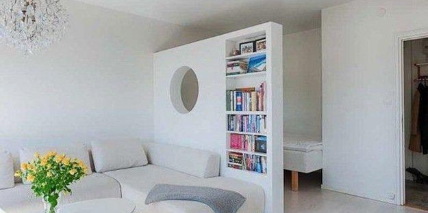 Pour ne pas acheter de bibliothèque, ils construisent une cloison en plaques de plâtre avec des étagères. Un tel mur a l'air original, où les ouvertures pour les livres sont situées des deux côtés. La stabilité d'un tel faux mur est assurée par le fait que les étagères alternent de différents côtés avec des tirages photo avec des images de folios.