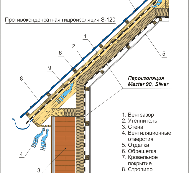 - L'utilisation de matériaux de haute qualité pour l'isolation contre la vapeur et thermique, l'installation compétente des matériaux. Il ne faut pas économiser sur l'isolation : un produit de qualité est toujours assez cher, mais il garantit la chaleur dans la maison et l'absence d'humidité sous le toit.La condensation ne se formera pas car l'air chaud et froid ne se heurtera pas. Une bonne couche d'isolation thermique doit être d'au moins 20 cm.