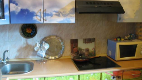 La solution moderne la plus populaire consiste à coller la façade de la cuisine avec un film avec impression photo. Cela vous permet de créer votre propre style unique.