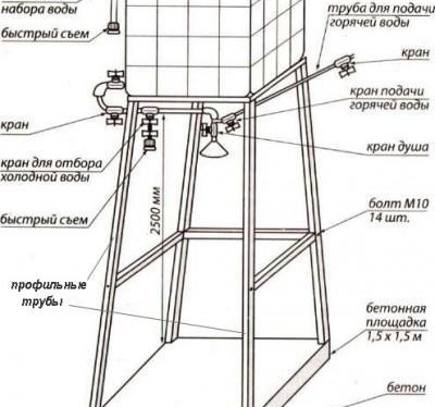 L'étape principale de la construction d'une douche de jardin de vos propres mains est l'installation de l'alimentation en eau. Un excellent réservoir pour l'approvisionnement en eau est un baril en métal ou un réservoir en plastique peint en noir. Volume standard - de 100 à 200 litres. Un indicateur de niveau d'eau ou une vanne doit être installé dans le réservoir, ce qui coupera le débit d'eau lorsque le réservoir est plein.