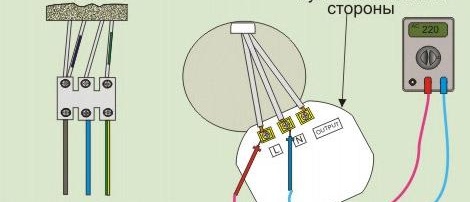 Au plafond, ils connectent ensuite le commun à l'un des deux fils restants (naturellement, mais pas au fil de terre) et le courant est allumé. Une petite tension doit apparaître entre les extrémités dénudées des fils connectés, qui peuvent être mesurées avec un multimètre.