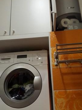 La machine à laver est ordinaire, profondeur 40 cm et charge 5 kilogrammes. La préférence a été donnée au modèle où la poignée était la plus basse possible pour faciliter le chargement.