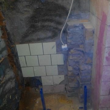 Lorsque le béton a durci, j'ai finalement procédé à raccordement du système à l'alimentation en eau et aux égouts. Après avoir vérifié l'étanchéité du système et m'être assuré que tout fonctionne et s'adapte, j'ai érigé un cadre pour cloison sèche. Ensuite, en découpant des trous pour les tuyaux, vissez la feuille. Tous les autres processus sont standard, apprêt et carrelage. Le résultat était un piédestal au-dessus de la machine à laver.