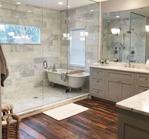 En ce qui concerne les carreaux de la salle de bain qui sont à la mode, de plus en plus de matériaux imitant le parquet sont mentionnés. La conception en bois apporte confort et chaleur, et aide également à se détendre mieux et plus rapidement, tant au niveau physique que subconscient.