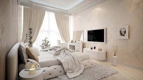 - Une telle pièce est plus positive, élégante, remplie de fraîcheur et de sophistication, tout en ayant un effet calmant sur le système nerveux, ce qui est tout simplement important pour la chambre à coucher. Même s'il y a un manque de lumière naturelle dans la pièce, les couleurs claires la rendront toujours beaucoup plus claire et plus fraîche. De plus, le choix des meubles dans ce cas deviendra plus simple et moins coûteux.