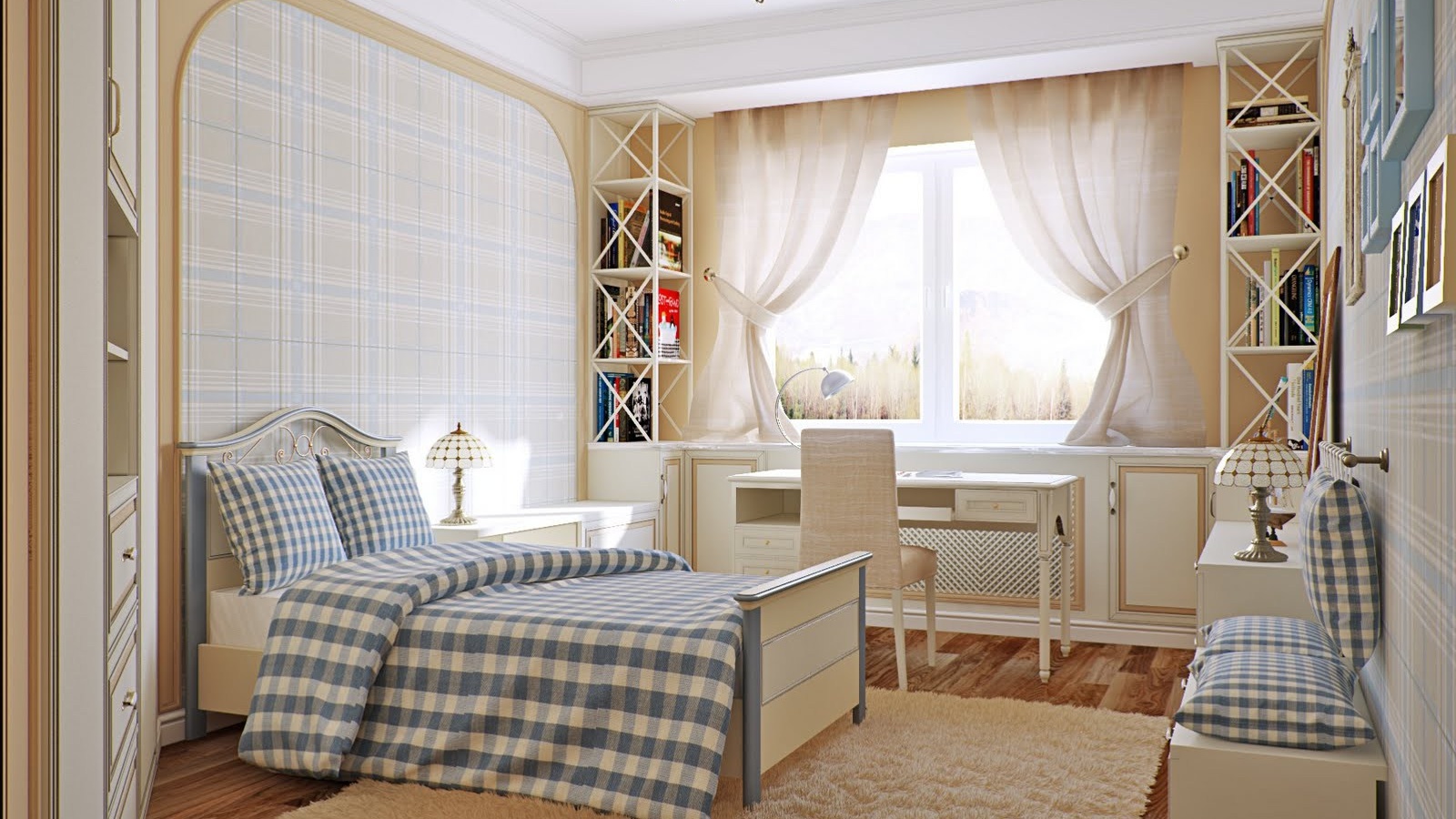 S'il y a des motifs, ils doivent également être calmes - des fleurs, une rayure ou une cage. Au sol, le bois ou le grès cérame marron clair, « sous le sapin », est le mieux adapté. Ne sous-estimez pas la présence de bibelots - ce sont les petites choses qui donnent l'intégrité intérieure et le confort de la pièce.