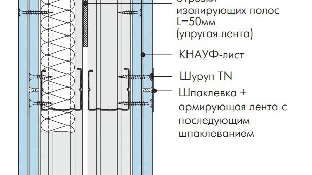 - La technologie d'installation des cloisons sèches Knauf permet la création de murs avec une résistance maximale, par conséquent, pour renforcement de sections individuelles de la structure il est nécessaire d'utiliser un profil double (insérer un dans un avec un chevauchement de 10% de sa largeur).