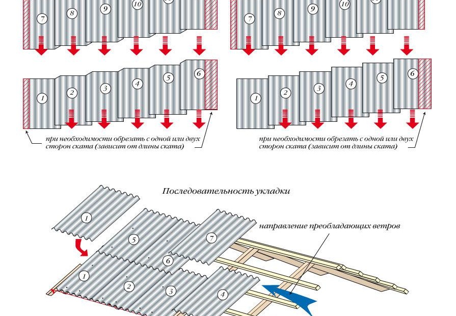 Le toit en plaques d'amiante-ciment est posé de deux manières: strictement l'une au-dessus de l'autre ou à part, en les déplaçant sur le côté dans chaque rangée superposée.