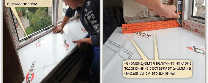 Pré-exposez le rebord de la fenêtre avec des cales, en obtenant sa pente dans la pièce de seulement 2 degrés. Le long de la fenêtre, le tableau est situé strictement horizontalement. Lorsque tous les indicateurs nécessaires sont atteints, les cales sont renforcées avec une petite quantité de mortier en retirant la pièce.