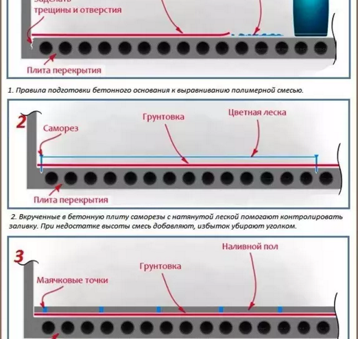 Pour cette raison, une ligne doit être tracée au niveau du point mesuré jusqu'au mur opposé au niveau des points de contrôle. Lorsqu'il ne colle pas pendant la transition, vous pouvez commencer à verser sol autonivelant par les phares. Sinon, vous devrez abattre les éléments saillants avec un ciseau ou définir un nouveau niveau zéro (si l'élévation ne peut pas être éliminée).