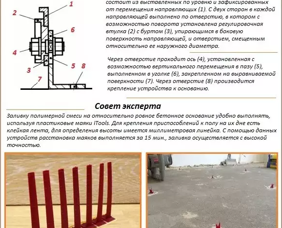 Aucun maître ne s'appuiera sur toutes les qualités d'un niveleur polymère en termes de bonne fluidité et de capacité à se répartir indépendamment uniformément sur toute la surface. Dans ce cas, des repères pour les sols autonivelants sont utilisés. Avec leur aide, l'horizontale est maintenue avec une précision de quelques fractions de millimètres.