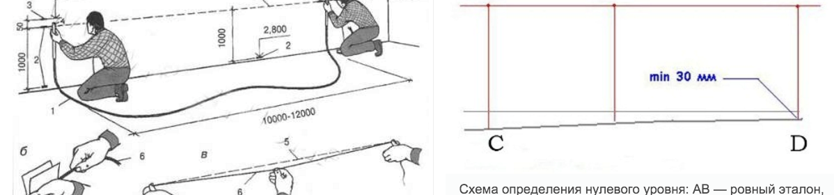 Initialement, un point est marqué à un niveau d'environ 100 cm du bas du sol dans la pièce. Des points de niveau similaires sont créés le long de tous les autres murs, après quoi tout est connecté en une seule ligne. Cette ligne continue est appelée la ligne de base. Il définit le niveau zéro.