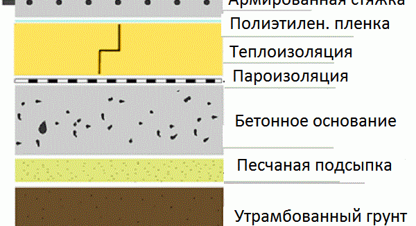 Le schéma peut être simplifié si les eaux souterraines sont situées à moins de deux mètres de la surface de la terre. Le coulage d'une chape brute peut même être effectué directement sur le sol. Le béton n'a pas peur de l'humidité, par conséquent, le film dans ce cas contribue à la rétention de la laitance du ciment. La force dans ce cas augmentera considérablement.