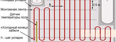Il vaut la peine de parler plus en détail directement de l'étape de pose, avant d'effectuer chape coulée sur le sol chaud. De la bordure de la zone chauffée de la pièce au câble chauffant posé, il doit y avoir la moitié de l'étape de pose. La surface à chauffer est la surface qui est égale à la surface totale du local où pose de chauffage au sol sous la chape, à partir de laquelle la zone de meubles est retirée, sous laquelle l'installation d'éléments chauffants ne sera pas effectuée: