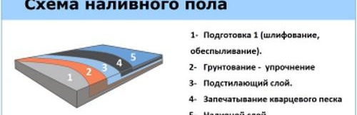 La solution finie est versée sur la base préparée. Il convient de noter que l'installation doit être effectuée depuis le coin le plus éloigné de la pièce, où tout se déverse. Après verser nivelé sur la surface de la pièce avec une spatule ou une règle. Il n'est pas rare d'utiliser des mélanges à deux composants qui sont mélangés avant de verser.