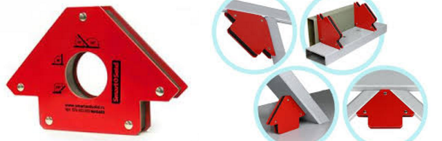Les supports magnétiques d'angle, utilisés pour fixer certains angles de pièces, sont utilisés avec succès aussi bien pour le soudage de tôles que de produits façonnés, tels que des tuyaux, des cornières, des tiges métalliques ou des fils. Le plus souvent, ces supports magnétiques ont la forme de formes géométriques - un triangle, un quadrilatère ou un pentagone. Les faces adjacentes ont un certain angle d'inclinaison, ce qui facilite la sélection de l'angle souhaité pour l'installation. La conception de tels supports est assez simple - deux plaques métalliques entre lesquelles un aimant est fixé.