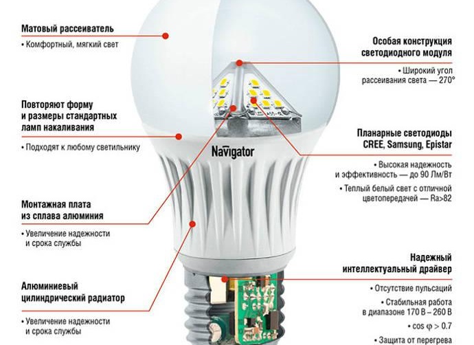 La présence d'un driver intégré dans la conception de la lampe LED, une LED puissante, contrairement à une ampoule classique, rend cette lampe non seulement plus économique, mais aussi durable, car les performances de la LED et du filament de tungstène sont incommensurables - la diode fonctionne dix fois plus longtemps.