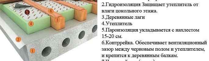 Des bûches de bois sont créées, sur lesquelles du contreplaqué est ensuite posé. L'espace résultant sous le contreplaqué peut être rempli avec absolument n'importe quel matériau d'isolation thermique. Cette option de création d'une base chaude contribue à l'utilisation de tout revêtement de sol à l'avenir. Aucune restriction n'apparaît.