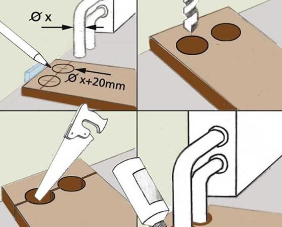Les trous dans le stratifié sont percés à l'aide de forets spéciaux, appelés ballerines. Dans le même temps, il convient de prêter attention au fait que les trous sont percés un peu plus, d'environ 2 cm, par rapport au diamètre requis des tuyaux dans la pièce. À l'avenir, tout sera scellé avec des bouchons en plastique spéciaux, qui peuvent être achetés dans n'importe quelle quincaillerie.