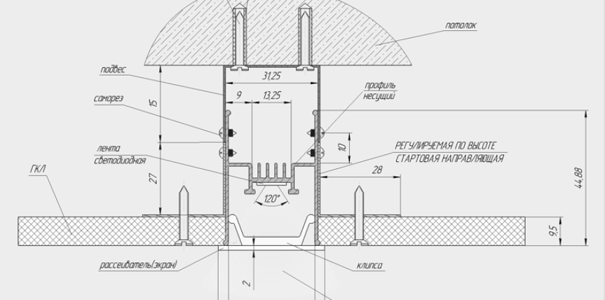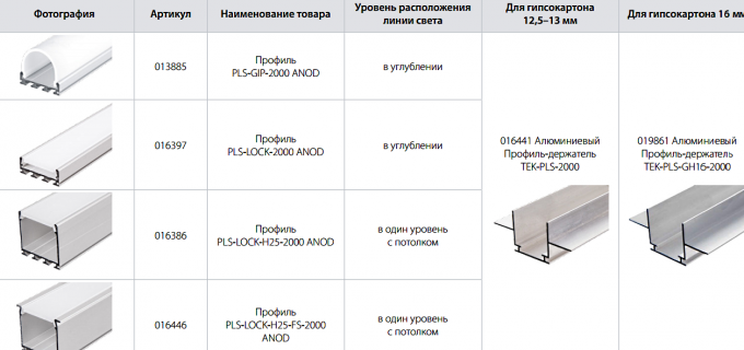 Cet article est en aluminium. Il est léger, ce qui est très important lors de l'installation dans un plafond en plaques de plâtre. Fondamentalement, pour la ligne de vol léger, le profil de marque PLS est utilisé, qui est installé sur le profil de support TEK, d'une épaisseur de 12,5, 13, 16 mm.