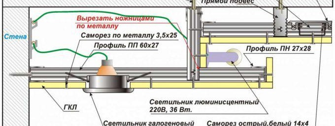 Il reste à monter les barres transversales. Leur longueur est inférieure de 1 cm à la distance entre les profils longitudinaux. Ils sont fixés à l'aide de connecteurs à un niveau (crabe) à des intervalles de 50 cm, de sorte que le bord de la plaque de plâtre - et sa longueur est un multiple de 50 - tombe au milieu du profil transversal pour plus de facilité et de fiabilité. de fixation. Toutes les connexions sont fixées avec des vis autotaraudeuses. Le résultat devrait être un dessin, comme sur la photo ci-dessus. Ensuite, le câblage est installé. Assurez-vous de placer les fils dans un tuyau ondulé ininflammable. Nous réalisons des boucles aux endroits où sont placés des projecteurs ou des lustres.