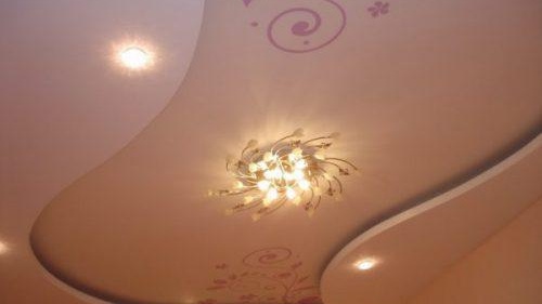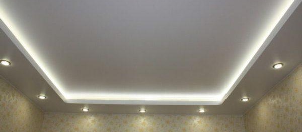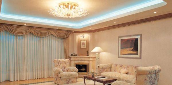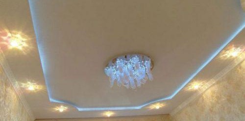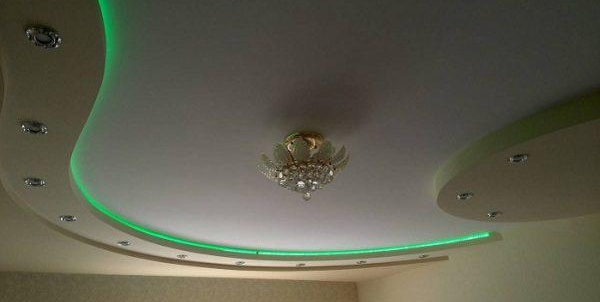 N'oubliez pas l'éclairage. Les plafonds en plaques de plâtre à deux niveaux avec éclairage, en plus du lustre central, doivent être équipés de bande led, duralight ou lampes au néon. De plus, vous pouvez ajouter des spots avec une tension de 220 volts aux premier et deuxième niveaux du plafond. Leur choix est immense et une simple énumération n'y fera rien.Tout est décidé par un choix spécifique de style et de conception de la structure du plafond.