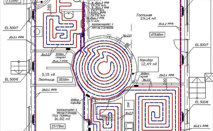 Une attention particulière doit être portée au choix du schéma de pose pipeline plancher chaud. Il peut y avoir plusieurs options de base : un serpent ou un escargot. La méthode «escargot» a la plus grande efficacité, lorsque les tuyaux sont situés sur toute la surface de la pièce en cercle, en partant des murs et en se dirigeant vers la partie centrale. Après avoir atteint le centre, le pipeline est redirigé vers l'arrière. L'efficacité réside dans le fait que le liquide de refroidissement chaud sera réparti sur tout le plan de la pièce. Il sera localisé, alternant avec un flux inverse, qui sera froid. Dans le même temps, il est très important de choisir l'étape du sol chaud pour la pose tuyaux, ce qui vous permettra de transférer la chaleur sur toute la surface du sol.