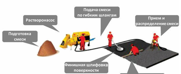 Le plus souvent, il est utilisé avec des différences de hauteur importantes dans la pièce, avec la présence de grandes fissures. En cela, tous les avantages d'une chape semi-sèche commencent à apparaître. Technologie de pose une telle solution permet de la réaliser sur de grandes surfaces. Certes, l'utilisation d'équipements spéciaux sera nécessaire, ce qui ne sera pas toujours disponible pour les propriétaires d'appartements ordinaires.
