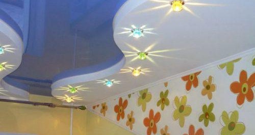 Tous ces facteurs peuvent être pris en compte et mis en œuvre en faisant plafonds en plaques de plâtre un ou plusieurs niveaux. Ils sont idéaux, principalement parce que le gypse ne provoque pas d'allergies. La santé de l'enfant est avant tout, car les plafonds en plaques de plâtre à un niveau sont très demandés lors de la décoration d'une chambre d'enfant. Une autre bonne caractéristique d'entre eux est la possibilité de modifier légèrement la conception du plafond en peu de temps. Sur une surface lisse, il y a où faire preuve d'imagination. Peindre avec des peintures colorées; coller du papier peint avec des fleurs agréables à l'œil d'un enfant; appliquer un papier peint photo; décorer avec des projecteurs avec des diffuseurs de lumière - ce n'est pas une liste complète des possibilités d'un tel plafond.