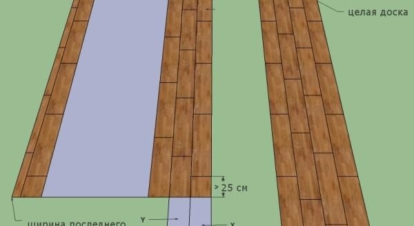 La suite du processus est plus rapide en termes de délais, car il y a plus de lamelles solides à étendu sur le sol. Il convient de noter qu'il est plus facile de les répartir initialement sur toute la surface de la base, puis de commencer à couper les planches et à les joindre aux murs.