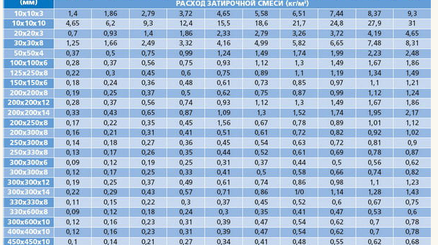 Le résultat obtenu sera plus précis avec une faible largeur des coutures. Et pour un calcul meilleur et plus rapide, il est préférable d'utiliser le calculateur de consommation de coulis pour les joints. Un système plus précis et complexe pour obtenir les données nécessaires est utilisé ici.