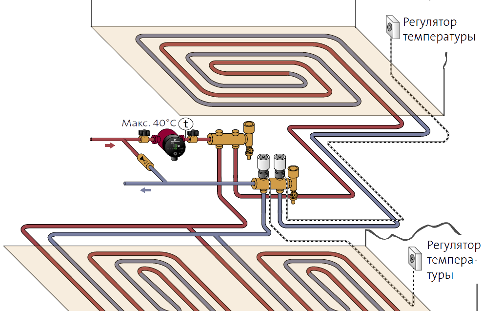 Vous pouvez combiner non seulement des schémas, mais également des types de chauffage par le sol. La version à eau peut être parfaitement combinée avec la version électrique et être interchangeable. Cela est particulièrement vrai en été, lorsque le chauffage central n'est pas allumé, vous devrez dépenser de l'électricité. Tout cela est créé pour le confort et la convivialité dans un quartier résidentiel.