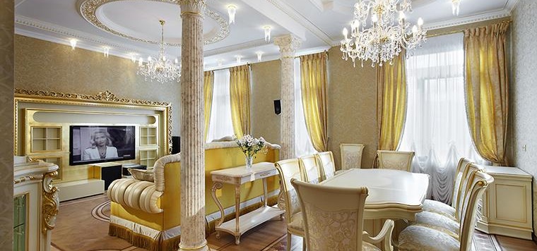 - Il y a une volonté de réaliser une structure complexe de plafond en plaques de plâtre qui va sur les murs: éléments bouclés, une boîte, mettant l'accent sur des objets design (par exemple, cloison bouclée - les mêmes figures au plafond, plafond voûté) ;