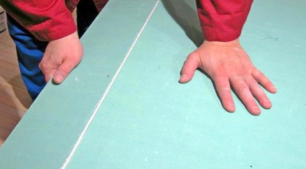 La feuille est posée sur une table plate. Il est marqué au crayon. Le long de la ligne, à l'aide d'une règle et d'un couteau bien aiguisé, une incision est pratiquée sur la moitié de l'épaisseur de la cloison sèche. Après cela, la partie incisée doit dépasser des limites de la table.Lorsque vous appuyez dessus, la feuille éclatera dans la zone de coupe. Une pièce doit être pliée, en laissant une bande de carton pliée de l'autre côté. Maintenant avec ces 2 pièces qui sont sur le même carton, faites un angle pair de 90 degrés.Le couteau est placé jusqu'à ce que la lame s'arrête dans le coin du coin de cloison sèche créé et soigneusement dessiné le long de toute la ligne de pliage. Ainsi, la feuille sera coupée uniformément.