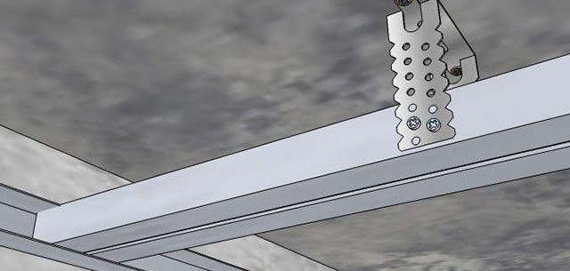 Fixation du profil de guidage pour le cadre sous cloison sèche - La prochaine étape sera de monter les cintres. La première rangée près du mur sur le projet de plafond - les suspensions sont fixées à une distance de 25 cm.Chaque rangée suivante - la fixation a lieu après 50 cm.Pour fixer l'élément, il est nécessaire de coller un mastic pour éliminer le contact du métal avec la surface du béton. Vous pouvez attacher le ruban à la suspension, puis le fixer. La suspension est fixée uniquement avec des boulons d'ancrage. Étant donné que le plafond en plaques de plâtre a du poids, il doit être monté de manière rigide. Les vis autotaraudeuses ne peuvent pas supporter la charge et sauter hors de la base.