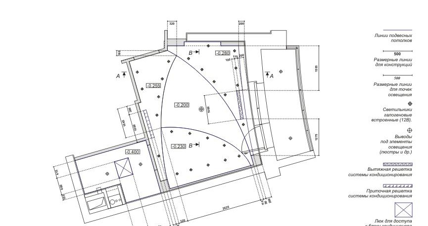 Pour créer un croquis sur papier, vous aurez besoin des dimensions de la pièce dans laquelle le plafond suspendu en plaques de plâtre est prévu. Dans ce projet, vous devez dessiner le plafond souhaité avec toutes les dimensions. Ici, le balisage du cadre est noté, les éléments bouclés du plafond suspendu en plaques de plâtre sont dessinés. Un circuit électrique pour l'éclairage est créé sur une feuille de papier séparée. Chaque lampe est marquée d'un point séparé. Le schéma montre l'interrupteur, les prises.