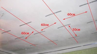 La deuxième étape consiste à tracer les lignes des guides de plafond directement sur le projet de plafond. Une feuille de cloison sèche est attachée autour du périmètre, ainsi que la ligne médiane. La taille standard de la feuille est de 120 cm, vous devez donc tracer des lignes tous les 60 cm. Ces lignes indiquent les points d'attache des suspensions.