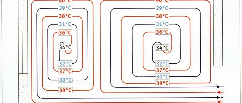 L'installation des tuyaux est effectuée le long du périmètre de la pièce, en partant des murs et en s'approchant de sa partie centrale. Le rayon est alors réduit. Le principal avantage d'un tel système est que la chaleur est répartie uniformément sur le support, réduit au minimum les pertes de chaleur et élimine également le risque de piqûres de chaleur dans le sol. L'espacement des tuyaux peut être au minimum de 10 mm, jusqu'à n'importe quelle distance choisie. Cela peut également être attribué à des qualités positives. Dès le début de l'apparition de la méthode de pose chauffage par le sol "escargot" il n'a pas cessé d'être considéré comme le plus fiable, le plus demandé, le plus travaillant.